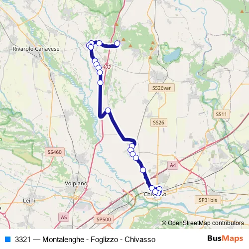 The first stop of the 3321 bus route is Fermata 23102 - Montalenghe (V. Meinardi) and the last stop is Fermata 10544 - Chivasso (Movicentro). 3321 (Montalenghe - Foglizzo - Chivasso) is operational during tutti i giorni.