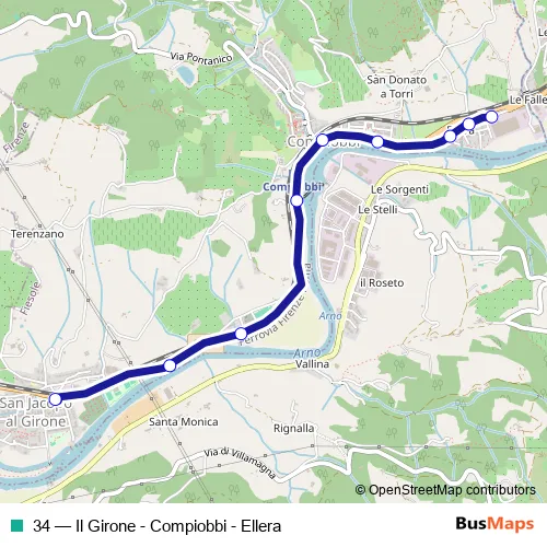 The first stop of the 34 bus route is Il Girone and the last stop is Le Falle. 34 (Il Girone - Compiobbi - Ellera) is operational during tutti i giorni.