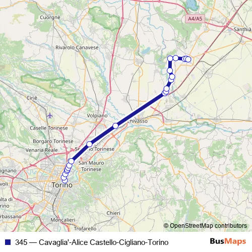 The first stop of the 345 bus route is Torino Autostazione VIA Fiochetto and the last stop is Cigliano Piazza Alleati. 345 (Cavaglia'-Alice Castello-Cigliano-Torino) is operational during tutti i giorni.