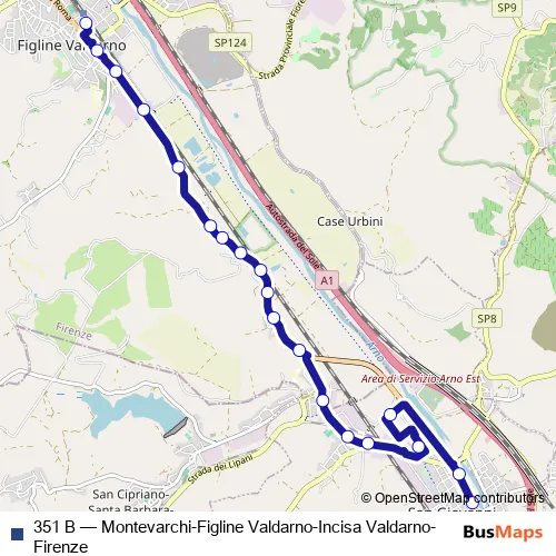 The first stop of the 351 B bus route is Piazza Palermo and the last stop is Figline Valdarno Fs. 351 B (Montevarchi-Figline Valdarno-Incisa Valdarno-Firenze) is operational during tutti i giorni.