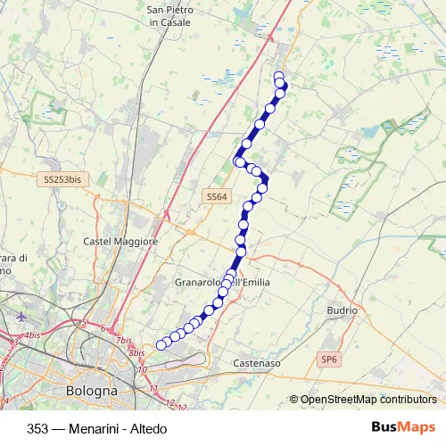 The first stop of the 353 bus route is Altedo and the last stop is Granarolo. 353 (Menarini - Altedo) is operational during nei giorni feriali.