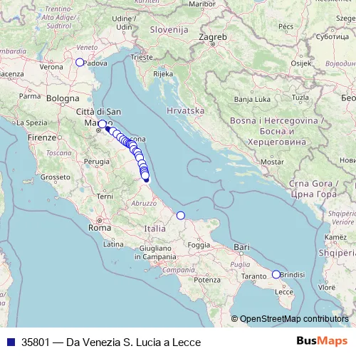The first stop of the 35801 rail route is Padova and the last stop is Brindisi. 35801 (Da Venezia S. Lucia a Lecce) is operational during tutti i giorni.