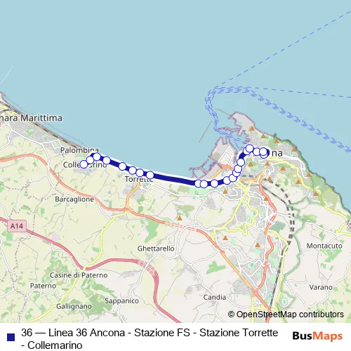 The first stop of the 36 bus route is Collemarino (Capolinea) and the last stop is Piazza Cavour. 36 (Linea 36 Ancona - Stazione FS - Stazione Torrette - Collemarino) is operational during tutti i giorni.