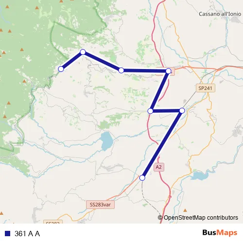 The first stop of the 361 A A bus route is Via Madre Teresa di Calcutta, 57 - Roggiano Gravina and the last stop is Strada Provinciale 263, 31 - Acquaformosa. 361 A A is operational during tutti i giorni.
