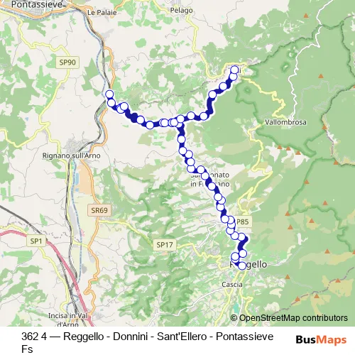 The first stop of the 362 4 bus route is Reggello Capolinea * P and the last stop is Sant'Ellero Fs *. 362 4 (Reggello - Donnini - Sant'Ellero - Pontassieve Fs) is operational during tutti i giorni.