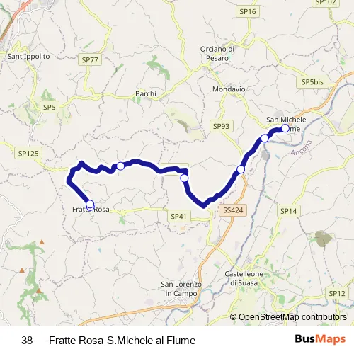 The first stop of the 38 bus route is Fratte Rosa (Banca) and the last stop is S.Michele al Fiume. 38 (Fratte Rosa-S.Michele al Fiume) is operational during tutti i giorni.