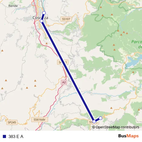 The first stop of the 383 E A bus route is Strada Statale 108bis, 15 - Colosimi and the last stop is Stazione Ferroviaria di Cosenza - Cosenza. 383 E A is operational during tutti i giorni.