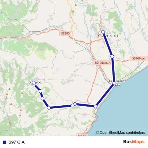The first stop of the 397 C A bus route is Via Piave - Catanzaro and the last stop is Corso Garibaldi, 37-41 - Girifalco. 397 C A is operational during tutti i giorni.