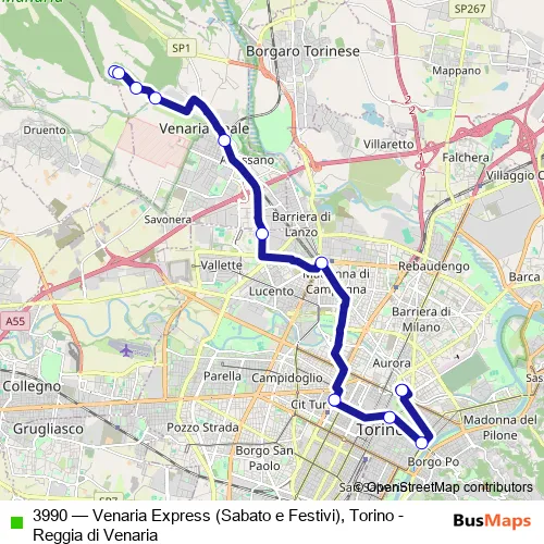 The first stop of the 3990 bus route is Fermata 9000 - Borgo Castello and the last stop is Fermata 10001 - Fiochetto. 3990 (Venaria Express (Sabato e Festivi), Torino - Reggia di Venaria) is operational during nel fine settimana.