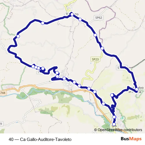 The first stop of the 40 bus route is Montecalvo (Centro) and the last stop is Ca Gallo 1 (Centro Smistamento). 40 (Ca Gallo-Auditore-Tavoleto) is operational during tutti i giorni.