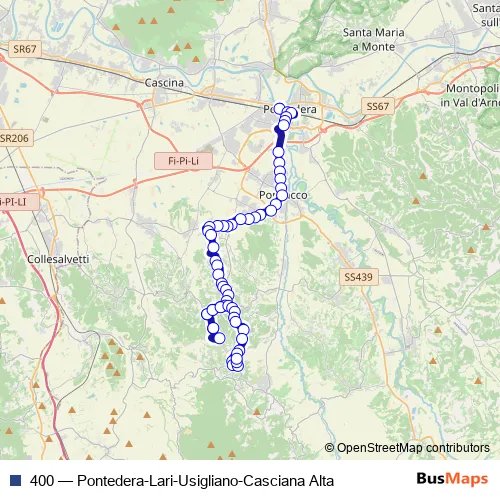 The first stop of the 400 bus route is Pontedera Corsia 1 and the last stop is Casciana Alta. 400 (Pontedera-Lari-Usigliano-Casciana Alta) is operational during tutti i giorni.