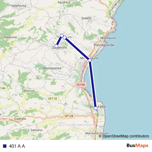 The first stop of the 401 A A bus route is Strada Provinciale 123, 77 - Gasperina and the last stop is Via Trento Trieste, 96 - Soverato. 401 A A is operational during tutti i giorni.