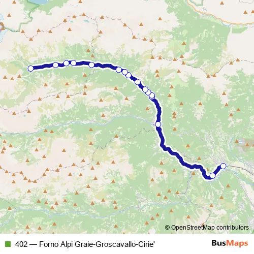 The first stop of the 402 bus route is Lanzo Torinese - Sangrilla' and the last stop is Forno Alpi Graie - Sp33. 402 (Forno Alpi Graie-Groscavallo-Cirie') is operational during nei giorni feriali.