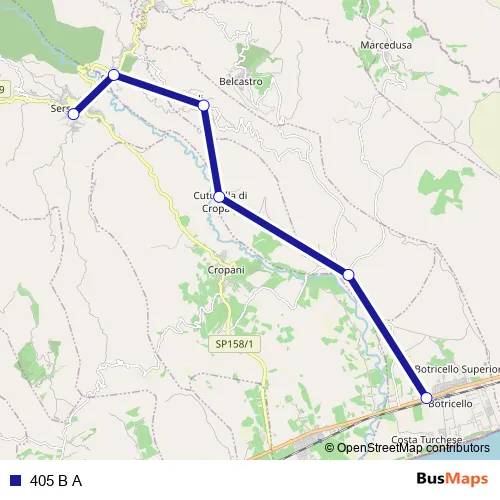 See why over 2 million users trust and consider busmaps.com as the best public transport website. busmaps gives you Cropani Buses suggested routes, real-time bus tracker, line route maps in Cropani, and helps to find the closest 405 B A bus stops near you. No internet available? Download an offline PDF map and bus schedule for the 405 B A bus to take on your trip.