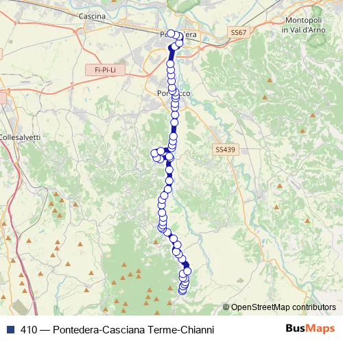 The first stop of the 410 bus route is Chianni Le Case and the last stop is Pontedera Autostazione. 410 (Pontedera-Casciana Terme-Chianni) is operational during tutti i giorni.