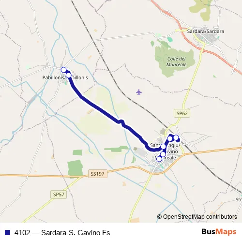 See why over 2 million users trust and consider busmaps.com as the best public transport website. busmaps gives you San Gavino Monreale Buses suggested routes, real-time bus tracker, line route maps in San Gavino Monreale, and helps to find the closest 4102 bus stops near you. No internet available? Download an offline PDF map and bus schedule for the 4102 bus to take on your trip.