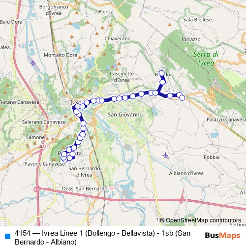 Services on the 4154 - Ivrea Linee 1 (Bollengo - Bellavista) - 1sb (San Bernardo - Albiano) bus stop at 19:53 on lunedì, martedì, mercoledì, giovedì, venerdì, sabato, domenica.