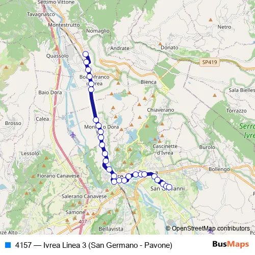 The first stop of the 4157 bus route is Fermata 11703 - Pavone (Ponte Chiusella) and the last stop is Fermata 11345 - SAN Germano (P.Za Pertini). 4157 (Ivrea Linea 3 (San Germano - Pavone)) is operational during tutti i giorni.