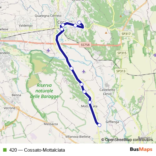 The first stop of the 420 bus route is Cossato - Stazione Ferroviaria - Movicentro and the last stop is Mottalciata - SAN Silvestro. 420 (Cossato-Mottalciata) is operational during nei giorni feriali.