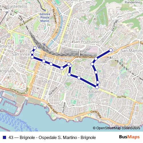 The first stop of the 43 bus route is Benedetto XV/Alberti and the last stop is Brignole FS/Capolinea. 43 (Brignole - Ospedale S. Martino - Brignole) is operational during tutti i giorni.