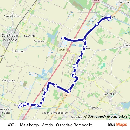 The first stop of the 432 bus route is Bentivoglio Ospedale and the last stop is Malalbergo. 432 (Malalbergo - Altedo - Ospedale Bentivoglio) is operational during nei giorni feriali.
