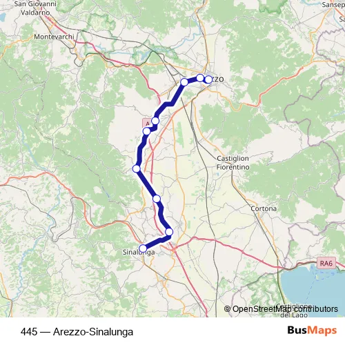 The first stop of the 445 bus route is Sinalunga Rfi and the last stop is Arezzo Rfi. 445 (Arezzo-Sinalunga) is operational during tutti i giorni.