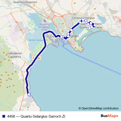 The first stop of the 4458 bus route is Fermata di Quartu V.Le Colombo-EX Municipio (Quartu Sant'Elena) and the last stop is Fermata di Sarroch Z.I. Enichem. 4458 (Quartu-Selargius-Sarroch Zi) is operational during nei giorni feriali.