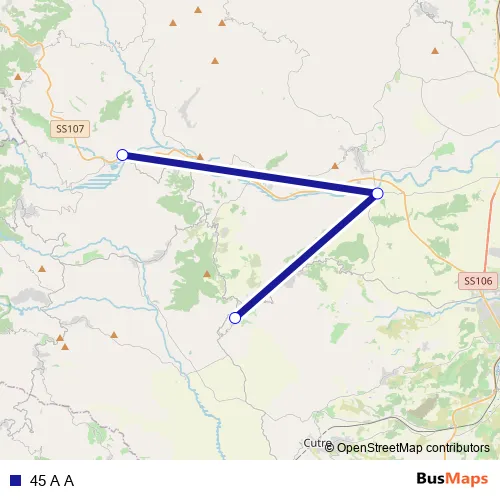The first stop of the 45 A A bus route is Strada Statale 107 Silana Crotonese - Caccuri and the last stop is Via M. Megali - San Mauro Marchesato. 45 A A is operational during tutti i giorni.