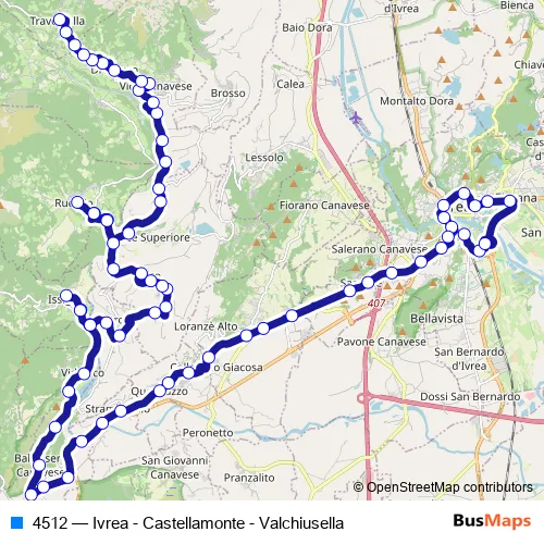 The first stop of the 4512 bus route is Fermata 11242 - Ivrea (Movicentro) and the last stop is Fermata 15077 - Traversella. 4512 (Ivrea - Castellamonte - Valchiusella) is operational during tutti i giorni.
