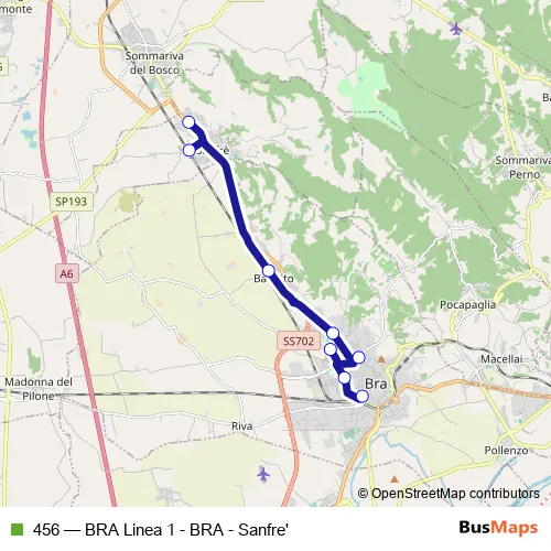 The first stop of the 456 bus route is Inizio Circonvallazione Lato Sommariva and the last stop is BRA - P.Za Roma. 456 (BRA Linea 1 - BRA - Sanfre') is operational during tutti i giorni.