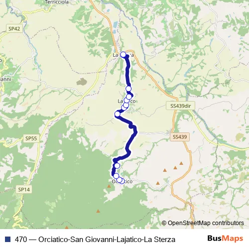 The first stop of the 470 bus route is Orciatico P.Za Del Popolo and the last stop is La Sterza Park. 470 (Orciatico-San Giovanni-Lajatico-La Sterza) is operational during tutti i giorni.
