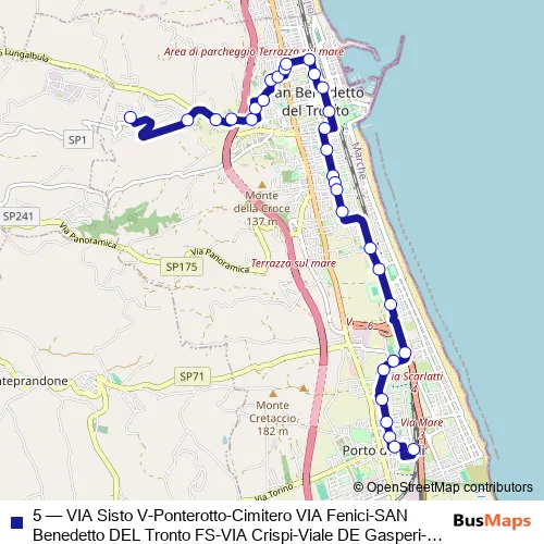 The first stop of the 5 bus route is Contrada Albula - VIA Sisto and the last stop is Stazione DI Porto D'Ascoli. 5 (VIA Sisto V-Ponterotto-Cimitero VIA Fenici-SAN Benedetto DEL Tronto FS-VIA Crispi-Viale DE Gasperi-Viale Dello Sport-VIA Turati-Porto D'Ascoli Fs) is operational during tutti i giorni.