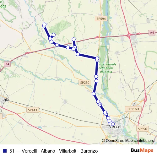 The first stop of the 51 bus route is Vercelli Autostazione C.So Gastaldi and the last stop is Buronzo Piazza Cavour. 51 (Vercelli - Albano - Villarboit - Buronzo) is operational during nei giorni feriali.