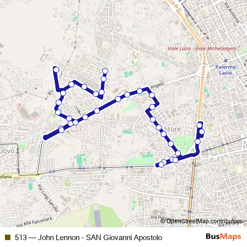 The first stop of the 513 bus route is Brunelleschi Vanvitelli and the last stop is Piazzale John Lennon 513. 513 (John Lennon - SAN Giovanni Apostolo) is operational during tutti i giorni.