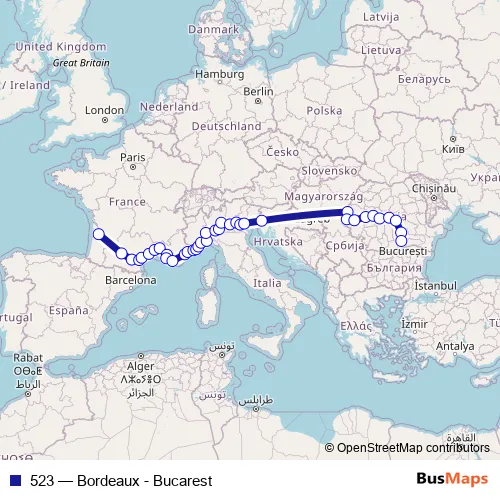 The first stop of the 523 bus route is Bucuresti and the last stop is Bordeaux, St Jean. 523 (Bordeaux - Bucarest) is operational during tutti i giorni.