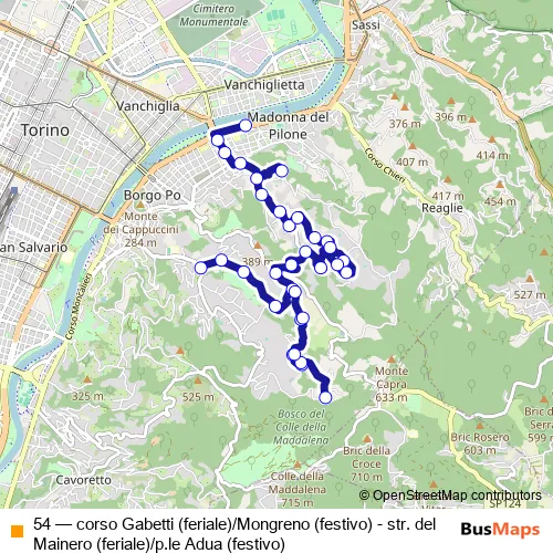 The first stop of the 54 bus route is Fermata 1442 - Gabetti Cap and the last stop is Fermata 1485 - Mainero Cap. 54 (corso Gabetti (feriale)/Mongreno (festivo) - str. del Mainero (feriale)/p.le Adua (festivo)) is operational during tutti i giorni.