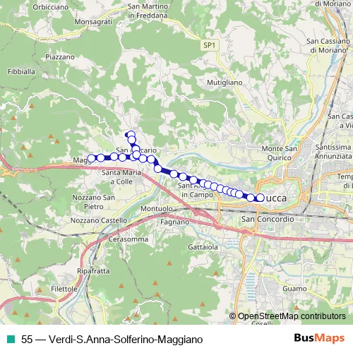 The first stop of the 55 bus route is Maggiano Chiesa and the last stop is Terminal Lucca 17. 55 (Verdi-S.Anna-Solferino-Maggiano) is operational during tutti i giorni.