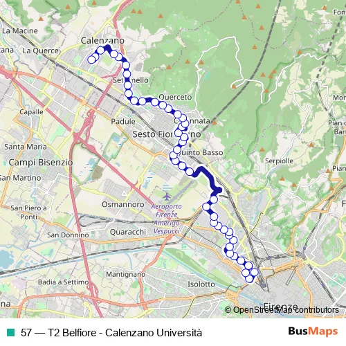 The first stop of the 57 bus route is T2 Belfiore and the last stop is Calenzano Universita'. 57 (T2 Belfiore - Calenzano Università) is operational during tutti i giorni.