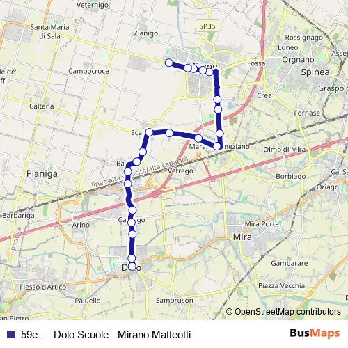 The first stop of the 59e bus route is Dolo Centro and the last stop is Mirano Matteotti. 59e (Dolo Scuole - Mirano Matteotti) is operational during tutti i giorni.