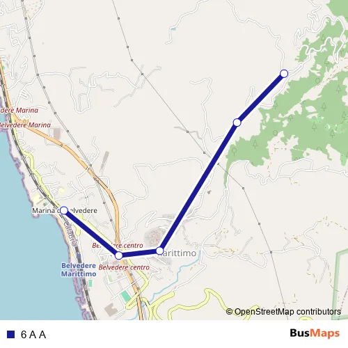 The first stop of the 6 A A bus route is Contrada Laise, 67 - Belvedere Marittimo and the last stop is Piazza Giovanni Grossi, 49 - Belvedere Marittimo. 6 A A is operational during tutti i giorni.