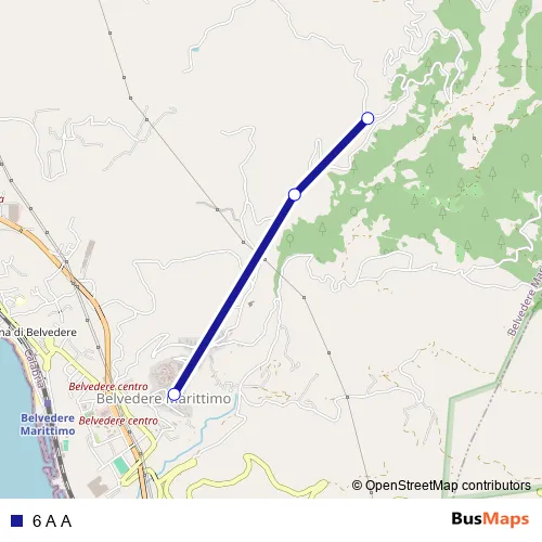 The first stop of the 6 A A bus route is Contrada Laise, 67 - Belvedere Marittimo and the last stop is Piazza Amellino, 14 - Belvedere Marittimo. 6 A A is operational during tutti i giorni.