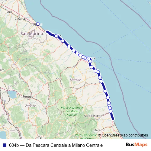 The first stop of the 604b rail route is Porto d'Ascoli and the last stop is Rimini. 604b (Da Pescara Centrale a Milano Centrale) is operational during tutti i giorni.