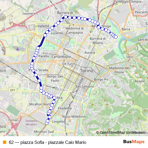 See why over 2 million users trust and consider busmaps.com as the best public transport website. busmaps gives you Turin Buses suggested routes, real-time bus tracker, line route maps in Turin, and helps to find the closest 62 bus stops near you. No internet available? Download an offline PDF map and bus schedule for the 62 bus to take on your trip.