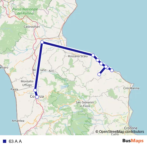 The first stop of the 63 A A bus route is Autostazione Cosenza - Cosenza and the last stop is Via Nazionale, 115 - Mandatoriccio. 63 A A is operational during tutti i giorni.