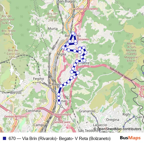 The first stop of the 670 bus route is Canepari/Capolinea and the last stop is Reta 1/Barchetta. 670 (Via Brin (Rivarolo)- Begato- V Reta (Bolzaneto)) is operational during tutti i giorni.