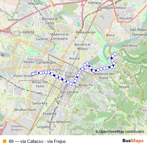 The first stop of the 68 bus route is Fermata 1770 - Cafasso Cap and the last stop is Fermata 2097 - Frejus Cap. 68 (via Cafasso - via Frejus) is operational during tutti i giorni.