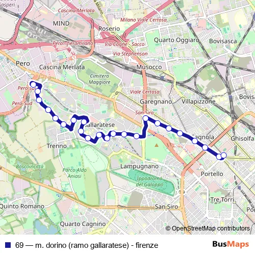 The first stop of the 69 bus route is molino dorino m1 and the last stop is p.za firenze. 69 (m. dorino (ramo gallaratese) - firenze) is operational during tutti i giorni.