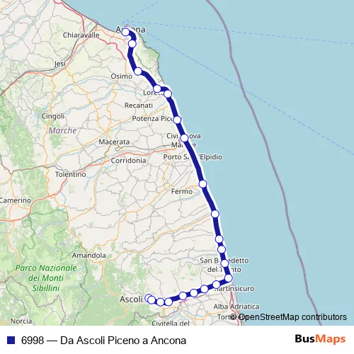 The first stop of the 6998 rail route is Ascoli Piceno and the last stop is Ancona. 6998 (Da Ascoli Piceno a Ancona) is operational during tutti i giorni.