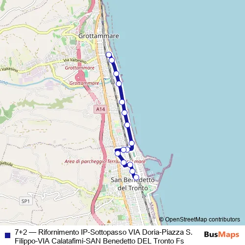 The first stop of the 7+2 bus route is Grottammare - Hotel Marconi and the last stop is S. Benedetto DEL TR. - Stazione Ffss. 7+2 (Rifornimento IP-Sottopasso VIA Doria-Piazza S.Filippo-VIA Calatafimi-SAN Benedetto DEL Tronto Fs) is operational during tutti i giorni.