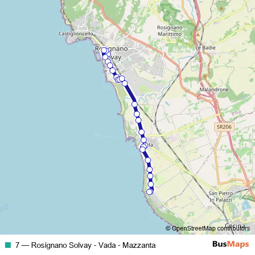 The first stop of the 7 bus route is P.Zza Musselburgh and the last stop is Mazzanta Piscina Comunale. 7 (Rosignano Solvay - Vada - Mazzanta) is operational during tutti i giorni.